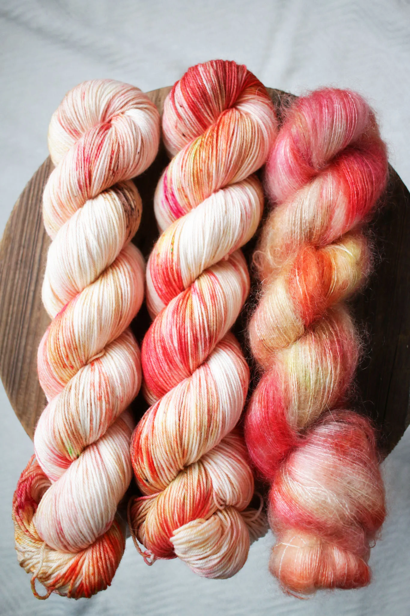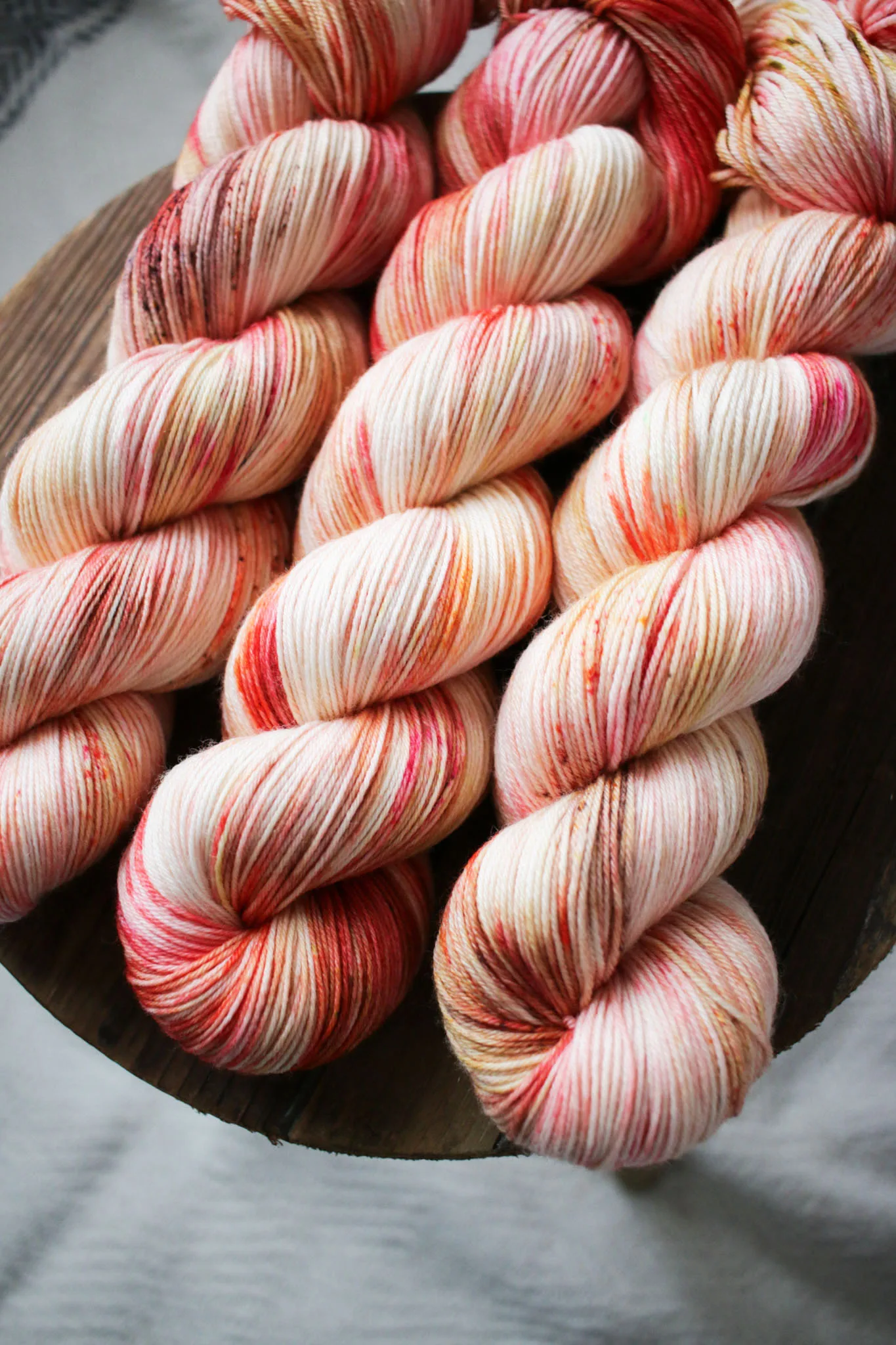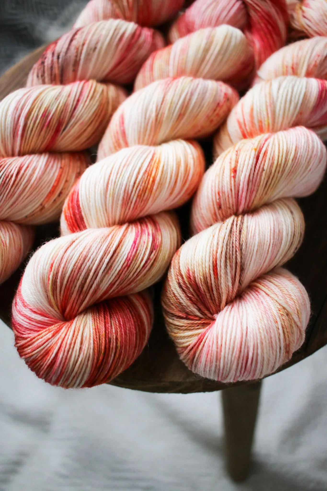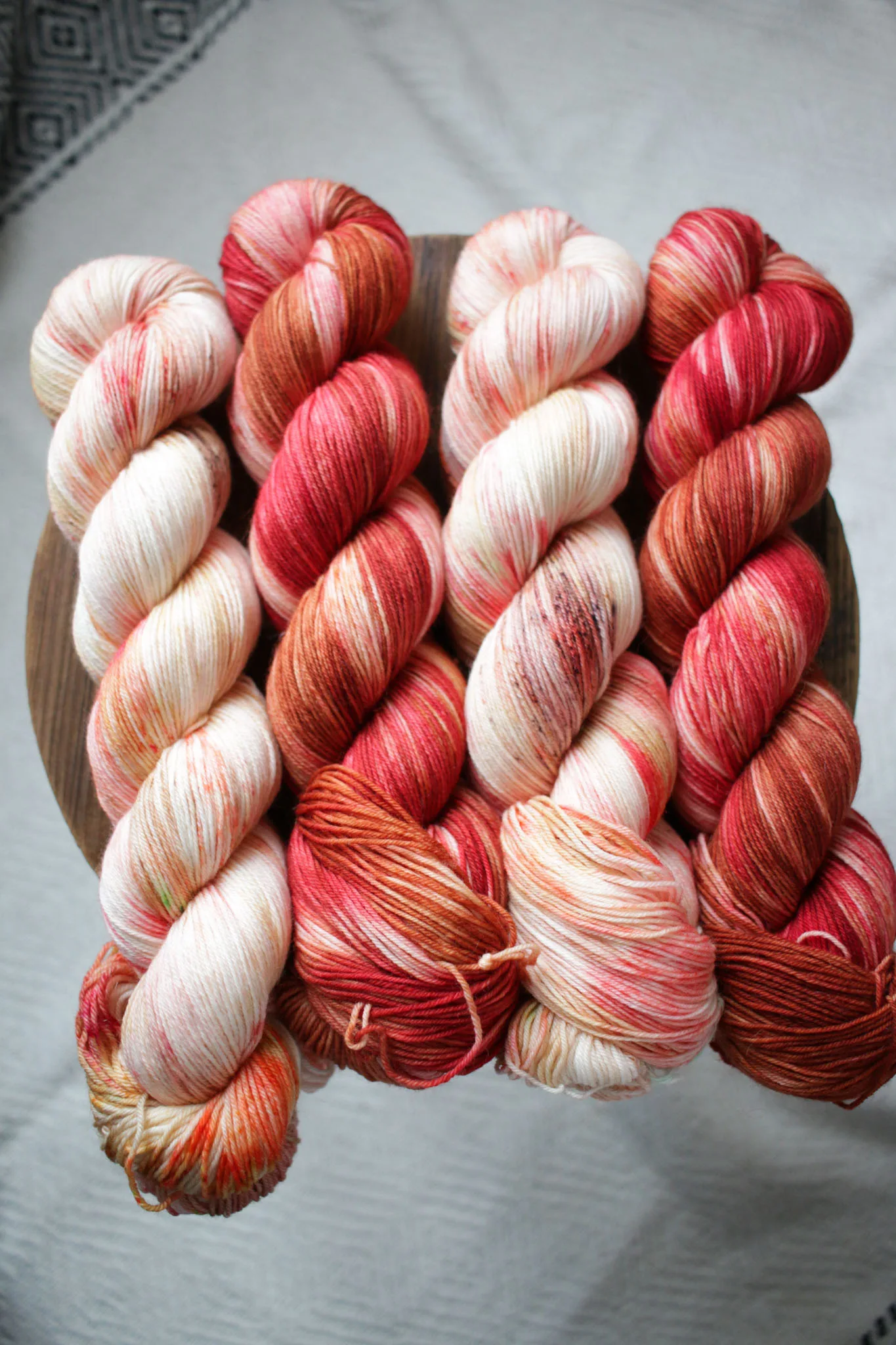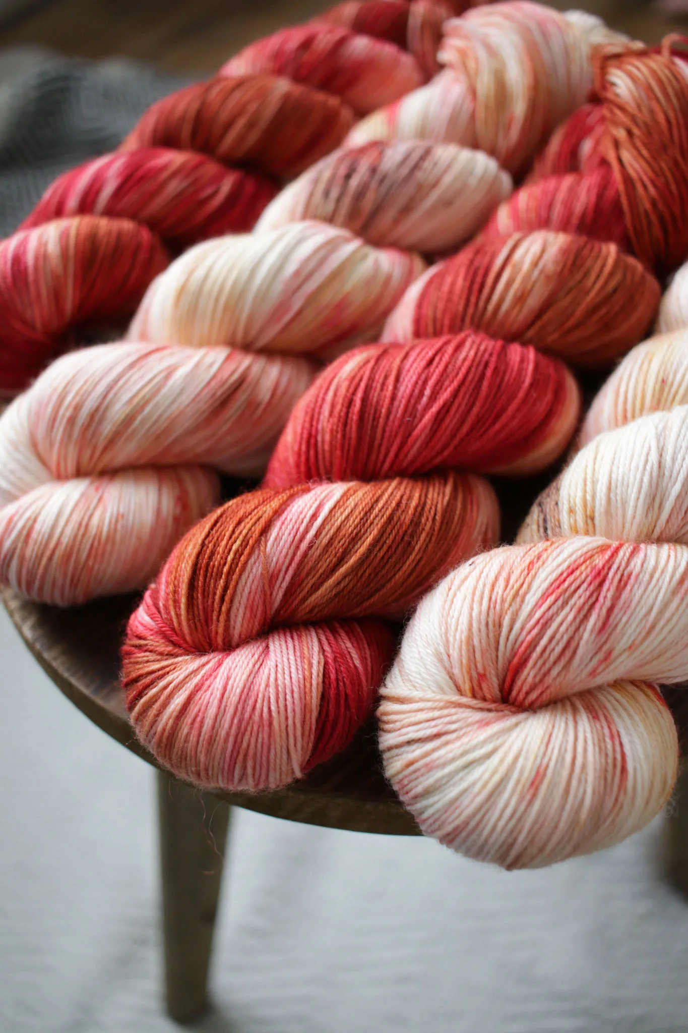 Écheveau teint à la main, disponible sur plusieurs bases de laines au choix.