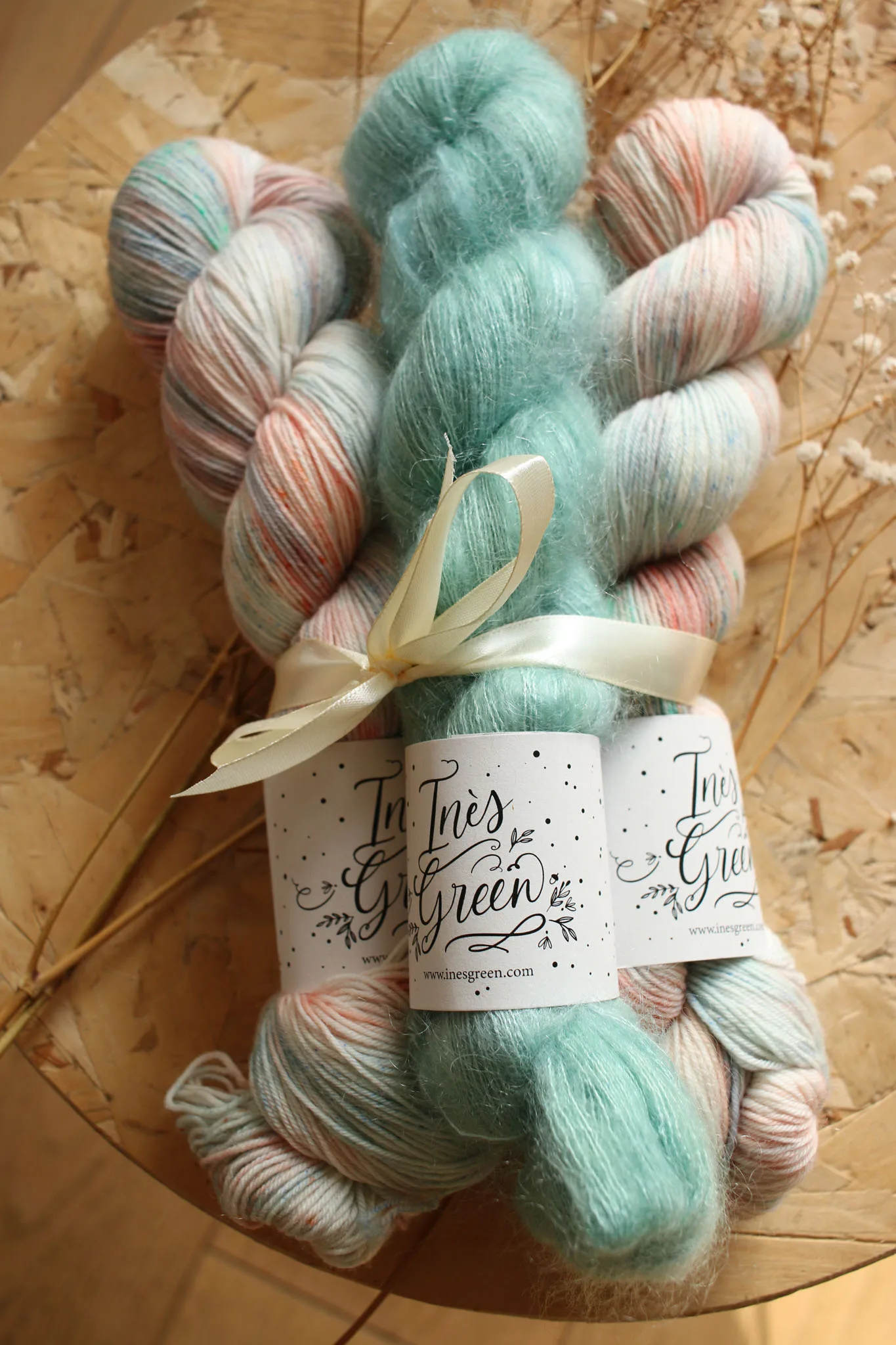 L’harmonie des couleurs créées une palette équilibrée et sophistiquée, parfaite pour réaliser un châle intemporel qui s’adaptera à toutes les saisons. Que vous soyez débutante ou tricoteuse expérimentée, vous apprécierez la facilité de travail de ces fils et la beauté du rendu final.