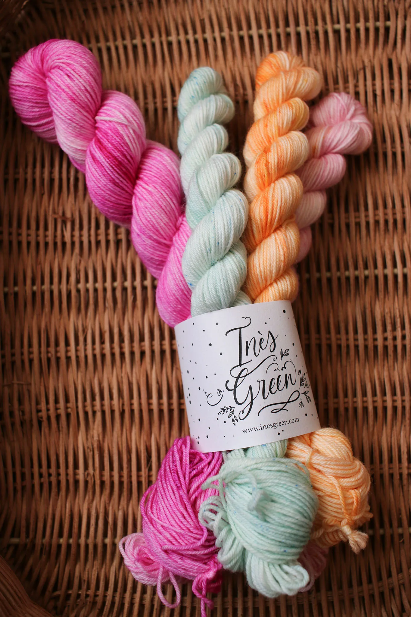 Kit chaussettes Daphné, parfait pour tricoter vos chaussettes avec des teintes vibrantes et teintes douces. Kit de laine teinte à la main. L’écheveau principal « Clématite », est un rose vibrant avec du fuschia et des speckles roses colorés. Il s’accompagne de trois minis contrastants : « Rose Garden » un rose orangé pastel délicat, « Vitamine » un orange lumineux et varié et « Bleu Menthe » un vert pastel doux. Un kit de laine artisanale idéal pour des chaussettes uniques.