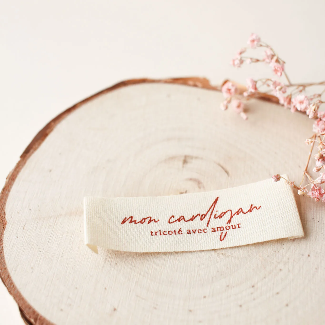 Etiquette à coudre « mon cardigan tricoté avec amour ».