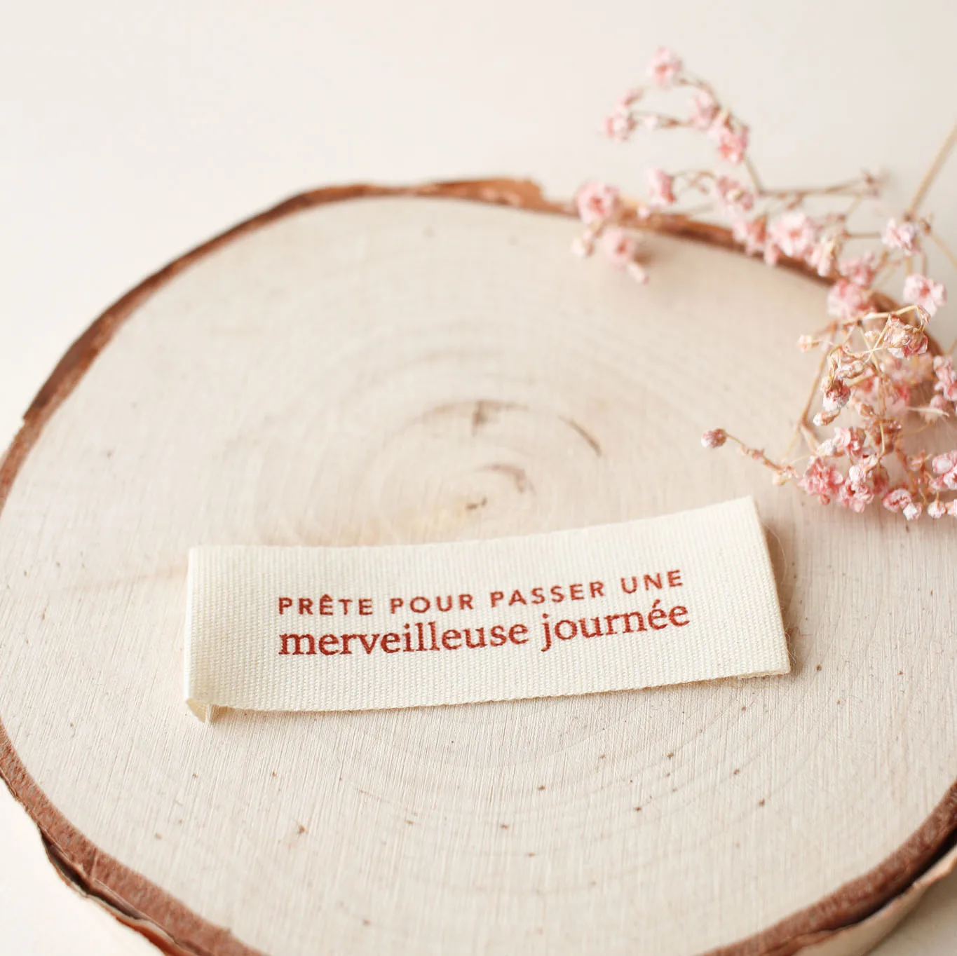 Etiquette à coudre « prête pour passer une merveilleuse journée ».